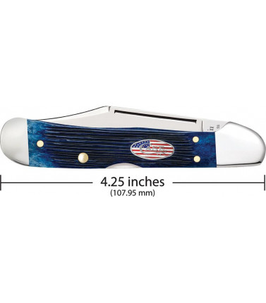 $78.99Case XX full size single blade Copperlock with Navy Blue Barnboard Jig Bone handles. 61549L SS Inlay full color flag shield. Stainless locking clip blade.