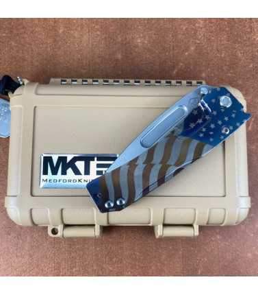 This Medford Slim Midi is in excellent unused condition. It features a 3 5/8" Compound ground Tanto blade of S35VN Steel. The Titanium frame is anodized with United States flag on front and a smooth blue anodize on back. Titanium pocket clip. Framelock. Dual studs. Knife in excellent condition with no signs of carry and original edge. Original box and accessories.