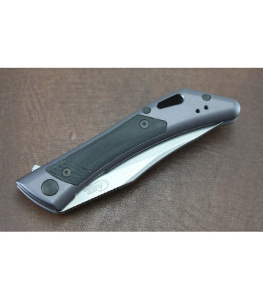 This version features a plain edge Spear Point blade of Premium S35VN Stainless Steel that rides easily on a steel ball-bearing pivot. The Handle is sleek Blue Anodized Aluminum. One handed Flip-open design with a finger flipper. Super strong framelock with steel insert for security when using the Kinzua for heavy chores. Reversable Deep Carry pocket clip.