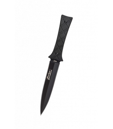 $49.99TecX Harley Boot Knife. Has a 3.75" long black finished stainless dagger blade. Black G-10 Handle. Futt tang construction. Blade etching. Black molded nylon belt sheath with lanyard. PRC -