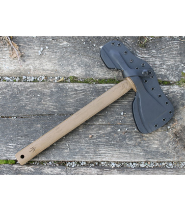 $189.00American Tomahawk Model 1 ACT810720 ATC-Hickory1-GP with Hickory Handle. Features a 1060 High Carbon Steel Black Head that is heat treated to HCR 56. Genuine Ryan Johnson Gold Point Forge Tennesse Hickory Handle. --Full Handle Length: 14 1/8" --Full Head Length: 8" --Blade Edge Length: 2 1/2" --Spike Length: 2 1/4" --Weight: 20 oz w/o sheath -- Bottom Eject Low Ride Black Kydex Sheath that includes low ride MOC straps for belt carry. Made in USA