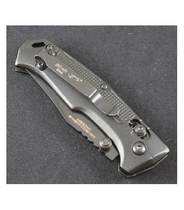 $61.25Bear MC-50-AIBK-B Rancor IV. Features a 2 5/8" black plain edge Modified Clip point blade of Sandvik Steel. Black Aluminum handles with grip ridges for secure handling. Glass-breaker. Features a slide lock and blade rides on precision ball bearing for the easiest of opening with one hand. Dual thumbstuds. All black hardware. Black pocket clip.