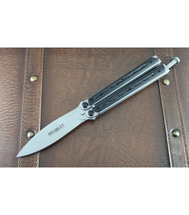 $119.99THIS ITEM SHIPS UPS ONLY! SORRY, NO INTERNATIONAL SALES! This Bradley Cutlery 900 Kimura Butterfly knife features a 3.875" flat ground plain edge spear point blade of 154CM Stainless Steel. Bronze Washers. Machined and contoured Black G-10 handle scales over steel frame. Reversable manual latch. Torq screw construction for blade adjustment or to remove G-10 scales for a thinner carry. The Kimura is a quality full size and weight butterfly that should hold up to years of use. FEATURES AND SPECIFICATIONS: --Blade Steel: 154CM Stainless --Blade Style: Spear Point --Blade Grind: Flat Grind --Blade Finiish: Bead Blast --Edge Type: Plain Edge --Handle Material: Stainless Steel - Bead Blast with Black G-10 onlays. --Lanyard Hole: No --Pocket Clip: No --Frame/Liner: Stainless Steel --Action: Manual - Butterfly --Latch: Manual - Reversable --Brand: Bradley Cutlery --Model Name: Kimura --Model Number: 900 --Use: Tactical - everyday Carry (EDC) --Blade Thickness: 0.13" --Cutting Edge: 3 5/8" --Blade Length: 3 7/8" --Handle Length: 5 " --Overall Length: 8 7/8" --Handle Thickness: 0.54" with G-10 scales --Weight: 5.9 oz Country of Origin: USA