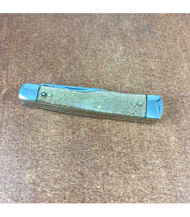 Case XX 1989 Centennial small Gunstock with Gold Stone celluloid handles. Polished Spear and Pen blades.