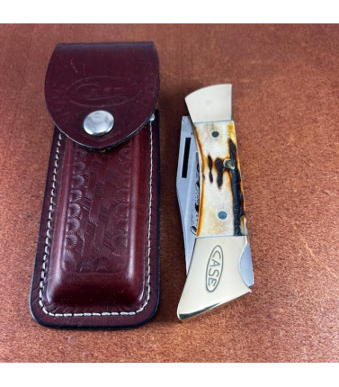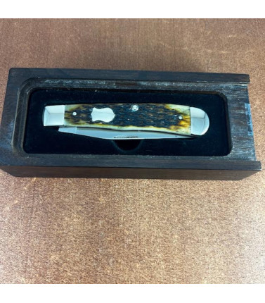 Case XX two blade Mini Trapper with Burnt Oat Bone handles. Stainless Clip and S;pey blades. 3 3/8" closed. Includes Original full color gift tin. We sold this originally in 2008 and was still sealed in factory plastic when we re-obtained it. Took plastic seal off to take picture - brand spanking new. Knife is as new - no signs of carry or use. Original factory edge. Original gift tin in excellent condition. USA