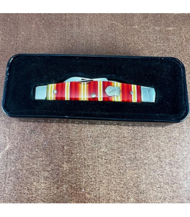 Case XX Case Brothers four blade Medium Congress with Candy Stripe Celluloid handles R4052 SS. Stainless blades. 3 1/2" closed. Includes Original full color gift tin. Knife is as new - no signs of carry or use. There are a couple of small scratches on one bolster. Original factory edge. Original gift tin showing some light storage scratches. USA