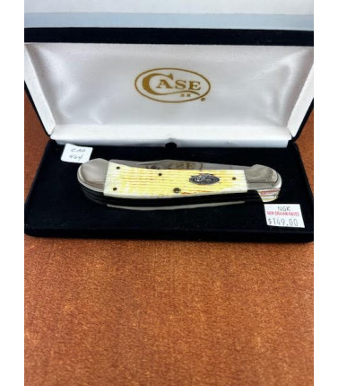 Case XX Collectors Club Life Member two blade Large Saddlehorn with Jigged Burnt oat bone handles. Case Collectors Club oval shield. Stainless Clip and Cotton Sampler blades.