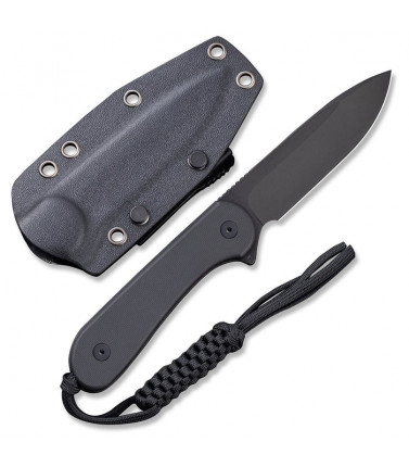 $69.99Civivi Elementum Tactical Fixed Blade Knife. Features a 4"plain edge drop point blade of black stonewashed finished hollow ground D2 tool steel. Black G-10 Handle scales over full tang construction. Attached lanyard included. Black Kydex sheath.