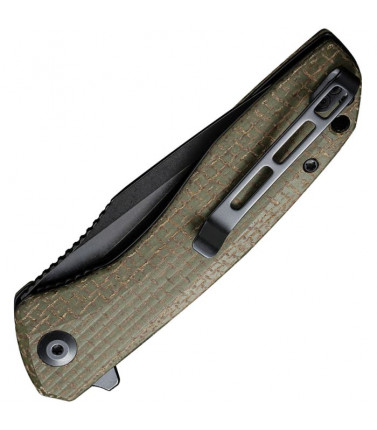 $57.80Civivi Caetus Flipper Linerlock. Features a 3 1/2" black finished plain edge drop point blade of 14C28N Sandvik Stainless Steel. Green Burlap Micarta handles. All black hardware. Finger Flipper opening. Pocket Clip. Caged ceramic bearing pivot. 4 1/2" closed. PRC