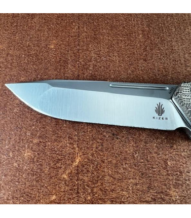 QSP Locust Flipper. Features a 3 3/4" hollow ground satin wharncliffe blade with black flats. VG-10 stainless steel. Linerlock. Flax Micarta handle scales. Skeletonized stainless steel liners. Blue anodized pocket clip. Knife is in excellent condition. Original factory edge. May have been lightly carried but no signs of ever cutting anything. Pocket clip shows some wear at the distal tip. Original box and paperwork in good condition. Made PRC