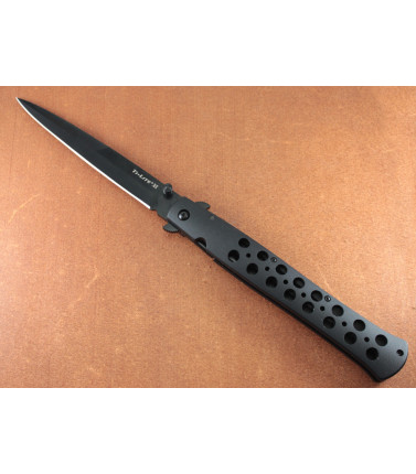 $199.97Ti-Lite tactical folders evoke the sleek speed and rebellious lines of the classic 1950's-styled switchblade. Unlike most switchblades however, they are legal to carry nearly everywhere. They feature American S35VN Alloy blades with DLC (Diamond Like Coating), razor sharp edges and sturdy, needle sharp points. The handles are made of high quality G-10. And for maximum strength and safety, Cold Steel has equipped the Ti-Lites with their patent pending, stainless steel leaf spring locks (proven, in their tests, to hold 130 lbs). For ease of carry, the Ti-Lites come equipped with a small, but unobtrusive steel pocket clip, and can be opened rapidly by using the thumb studs or by snagging a quillon on the edge of your pocket as you draw your knife out. We are grateful to custom knife maker, Phil Boguszewski, for his design influence and help in the creation of the Ti-Lites.