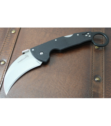 $125.00Created by celebrated custom-knife maker Andrew Demko, this exciting new multi-functional folder is simply overflowing with design innovations! The blade was designed following Andrew Demkos extensive testing and experimentation as a Journeyman Electrician and Engineer. When making his own multi-purpose hand-made work knives he made his own Karambit / Hawkbill hybrid blade that could cut rope, cable, wire and anything else his vocation threw in his path.This knife served him well through years of hard use, and, when tasked by Cold Steel® to develop his own take on a folding Karambit, this blade shape immediately came to mind. Replicating Andrews original blade design but in premium XHP steel, the Tiger Claw offers the tactical cutting and slashing performance of the Filipino and Indonesian fighting Karambit with the utility and function of a working mans Hawkbill. With the patented Demko thumb-plate, the Tiger Claw offers a fully ambidextrous fast draw from the pocket either in a saber grip or a traditional blade-down Karambit grip, deploying the blade with lightning fast ease! Made with his signature minimalist style, Demkos Tiger Claw features a slim line CNC machined US G-10 handle, a matte black aluminum ring , and our exclusive Tri-Ad® locking system. The Tri-Ad® lock is designed to withstand terrific impact forces while being almost impervious to shock, it has passed the most gruesome torture testing in the industry. SPECS: ---Weight: 5.1 oz ---Blade Thickness: 3.5 mm ---Blade Length: 3" ---Handle: 6" Long. G-10 ---Overall: 9" ---Steel: Carpenter CTS® XHP Alloy ---Pocket Clip: Ambidextrous Pocket / Belt Clip Imported. Personal Observations: Solid lock-up as expected fron the Tri-Ad lock. Truly amidextrious with thumb-plate and lockback design. Pocket Clip reversable for right or left side tip-up carry. Larger design for serious use. -