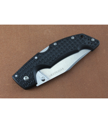 $62.97Cold Steel 29AC Voyager - Large - Clip Point - Plain Edge The Cold Steel Voyager series is designed to be the true 'everyman' knife. Lightweight, comfortable, and super sharp, they are rugged, dependable and perfect for hunting and camping as well as general utility and daily cutting chores. Voyagers excel in many survival and rescue applications, and they have proven to be very popular with Police and Military personnel, who appreciate the combination of the cutting performance and safety that they offer. Each knife in the extensive Voyager series is precision engineered and held to our most exacting standards. The Voyager series features Japanese AUS10A Alloy Blades, and our Tri-Ad locking mechanism - which is quite possibly the most secure, safe and shock resistant lock on the market today! The Voyagers ergonomic Griv-Ex handles (reinforced with heat treated 6061 aluminum liners) provide both great comfort and a secure grip even under extended use in tough conditions. Available in two sizes and with numerous blade and edge configurations, theres a Voyager for everyone SPECIFICATIONS: --WEIGHT: 4.6 oz. --BLADE THICKNESS: 3.5mm --BLADE LENGTH: 4" --HANDLE LENGTH: 5 1/4" --HANDLE MATERIAL: Black Griv-Ex with nested liners --STEEL / MATERIAL: Japanese AUS10A --OVERALL: 9 1/4" --ADDITIONAL FEATURES: ---Pocket Clips for right or left side tip-up carry --Dual Thumbstuds --Tri-Ad Lock Country of Origin: Taiwan -