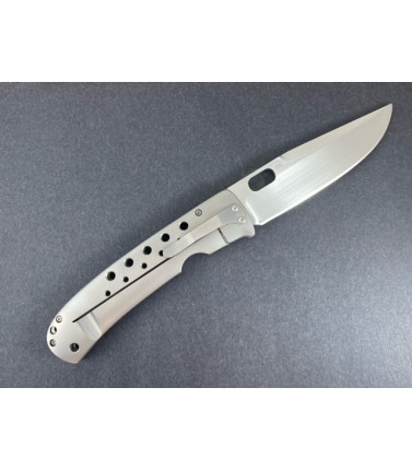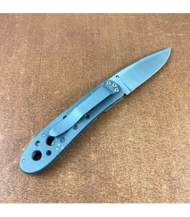 $650.00Direct from Crawford, this custom Leopard Cub features a 2 3/4" satin finished hollow ground blade of S30V stainless steel. Blasted titanium handles with fileworked backspacer. Single thumbstud. Linerlock. Blasted Titanium pocket clip.