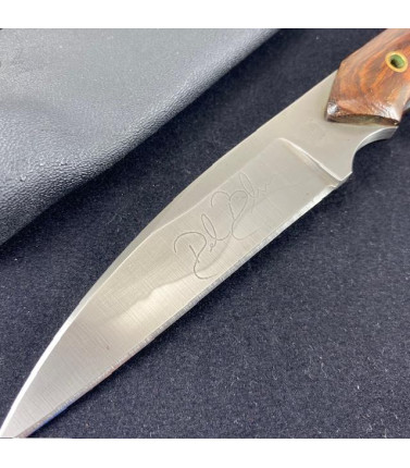 Features a 4 3/8" hollow ground wharncliffe blade with hamon. IIRC the blade steel is D2, but I can't be sure. Richly grained wood handles over the 5mm thick full tang.