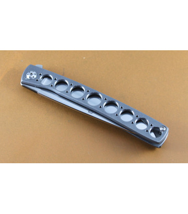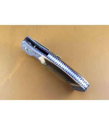 Berg Blades Mini Barber limited run by Reate. Features a 2 5/8" M390 blade. Blade has machined hollow ground bevel and hand rubbed satin flats. Titanium framelock with carbon fiber inlays. Upgraded with Berg Timascus Pocket clip, dual Timascus thumbstuds and Timascus Pivot Collars. Included are all the original "stock" parts.4 1/4" closed.