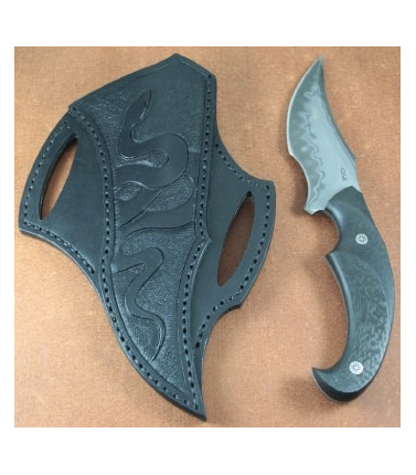 Brand new from maker, the full Custom CAS Snake features an elegant clip point recurve blade of expertly forged San Mai steel. Full tang constuction. Perfectly fitted sculpted Carbon Fiber handle scales secured with decorative pins. Hand tooled leather sheath and leather zippered case included.