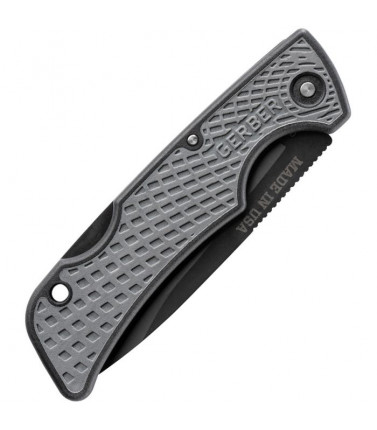 It features a black 2 1/2" plain edge blade of 420HC stainless steel. Glass filled nylon handle with textured gray overmold.