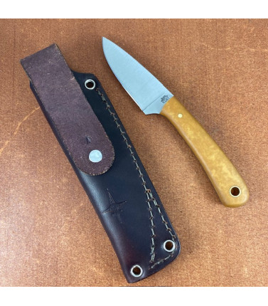 $135.00LT Wright Frontier Valley Fixed Blade. Features a 2 7/8" full flat ground blade of A2 Steel. Smooth Matte Maple Valley handles over full tang. Sharpened back spine for use with fire steel (not included). Leather belt sheath.