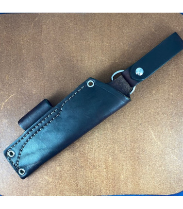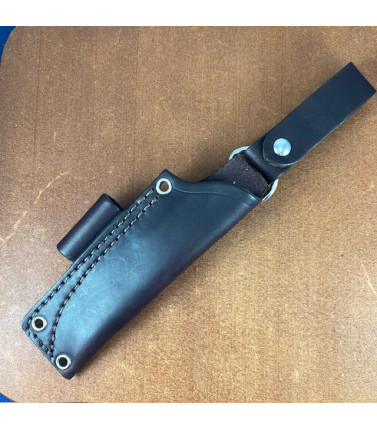 $245.00LT Wright Maverick Scout Fixed Blade. Features a 3 3/4" full flat ground blade of A2 Steel. Smooth Flat black dyed bone handles with black liners over full tang. Sharpened back spine for use with fire steel (not included). Leather belt sheath.