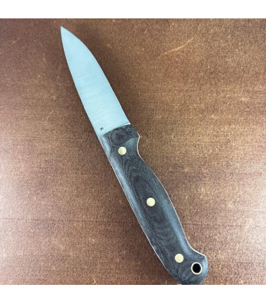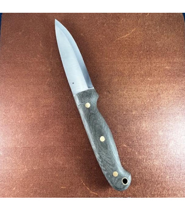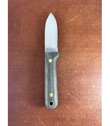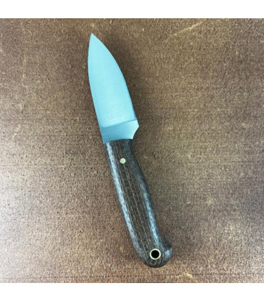 This Patriot features a 2 7/8" flat ground blade of PSB-27 Tool Steel. Matte Brown Burlap Micarta handles over full tang construction. Flat ground blade spine. 5 3/4" overall. Leather belt sheath.
