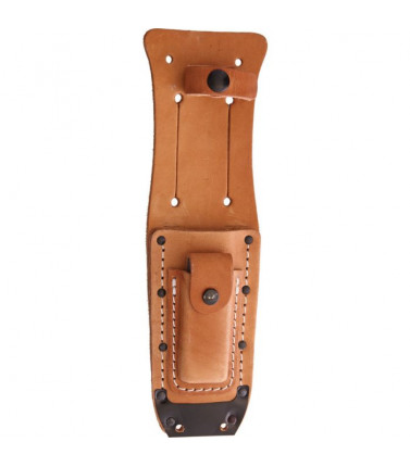 Features a 5" 1095 carbon steel plain edge blade with black DLC coating and sawback. Steel butt cap. Natural color stacked leather handle. Full tang construction. Leather sheath with whetstone and leg tie. 9 1/2" overall. USA