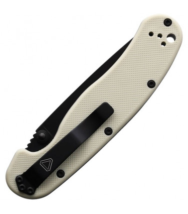 $44.95This Ontario RAT II folder featues a 3" black finished plain edge blade of AUS-8 stainless steel. Dual thumb studs. Textured Bone color nylon handle. Linerlock. Dual liners. PhosoBronze washers. 4 way reversible pocket clip. 4" closed.