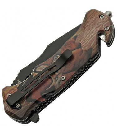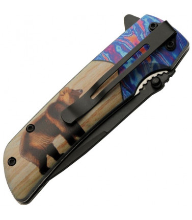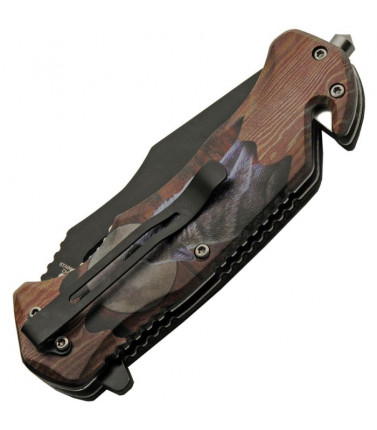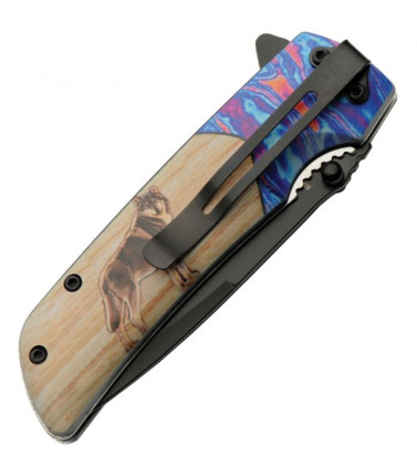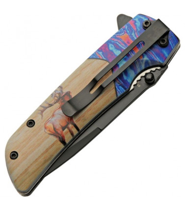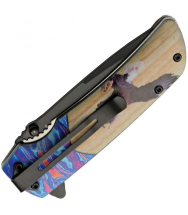 $16.995.75" (14.61cm) closed. Double 3.13" (7.95cm) two-tone finish stainless blades. Black and purple ABS handle. Finger flipper assisted opening. Linerlocks. Pocket clip. Bat shaped handle.