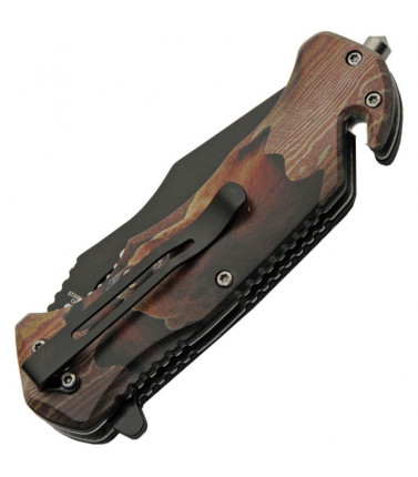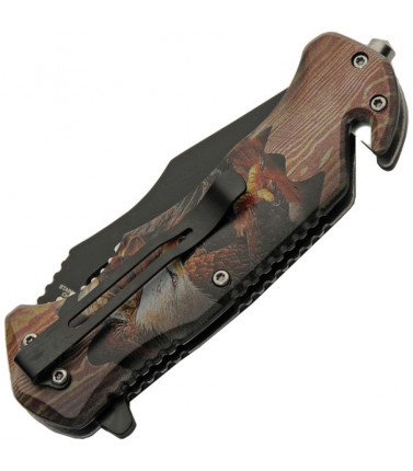 $49.9713" overall. 8" gray and black finish stainless sawback clip point blade. Black synthetic handle. Handle features rifle attachment. Green nylon belt sheath with accessory pouch and sharpening stone. PRC