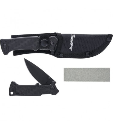 Blades are black oxide coated stainless steel. Black textured nylon handles. Also includes a 3.75" overall pocket sharpening stone. Gift Tin PRC