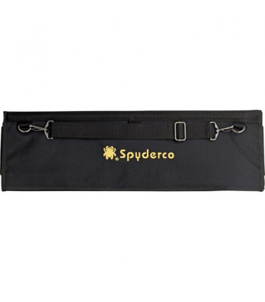 Constructed from heavy-denier polyeste Cordura, the pack has thirty deep pockets sized to hold even larger folders. Each pocket is fronted with a clear plastic window for viewing knives tucked inside. It tri-folds over and seals closed by way of a Velcro strip running the width of the pack. The knives remain secure and separated in their pockets and cannot rub or scratch against each other. An adjustable length shoulder strap attaches with two durable steel D-rings letting you hang the pack for display on a wall or sling it over your shoulder to take with you. Spyderco's name and bug logo are embroidered in gold thread on the closingflap. Available in black.