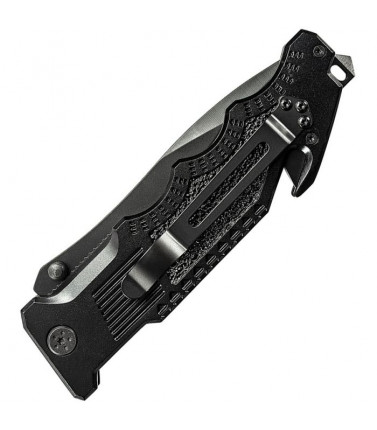 Features a 3 1/2" matte black finished Stainless partially serrated modified drop point blade. Aluminum handle with Black and White American Flag Embellishment. Pocket Clip. Thumb-stud. Lanyard Hole