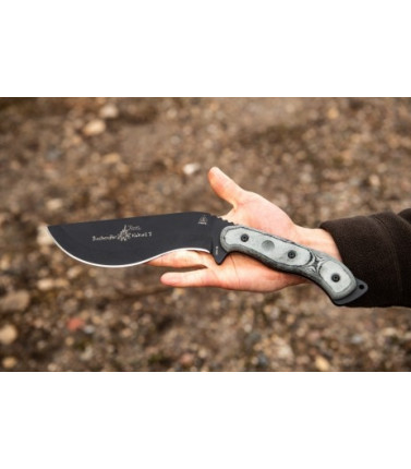 This new version has slight modifications to make everything about it better. First, the blade is just a bit longer, which makes it look and perform better. The jimping was repositioned and updated. The finger choil was widened slightly to make it safer. Then the handles are a bit thicker with a better contour to make them much more comfortable for long use. The new finish is Cerakote instead of powder coat, and now it has a Coyote Tan Kydex sheath with a rotating clip. All these changes make this an excellent knife for hunting, camping , or even as a self-defense blade. It's the Shadow Hunter you loved, only better. This isn't just another knife. It's a piece of TOPS history, made relevant for today