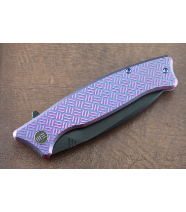 $253.00WE Knife 712A Balaenoptera Rainbow AnodizedTitanium Flipper with Black finished Bohler M390 plain edge blade. The Balaenoptera is a large but lightweight Framelock Flipper that is smooth and ready for any task. FEATURES and SPECIFICATIONS: --Overall Length: 8.6" (219mm) --Blade Length: 3.55" (90.3mm) --Blade Thickness: 0.16" (4mm) --Blade Material: Bohler-M390 --Blade Hardness: HRC59-61 --Blade Grind: Flat --Handle Length: 5.05" (128.7mm) --Handle Overall Thickness: 0.53" (13.6mm) --Handle Material: 6AL4V Titanium --Clip Material: 6AL4V Titanium --Back Spacer Material: 6AL4V Titanium --Screws Material: 6AL4V Titanium --Pivot Cap: 6AL4V Titanium --Washers Material: Ceramic Ball Bearing --Weight: 140g / 4.9oz --Lock Type: Frame Lock Includes WE padded zippered pouch. Country of Origin: PRC