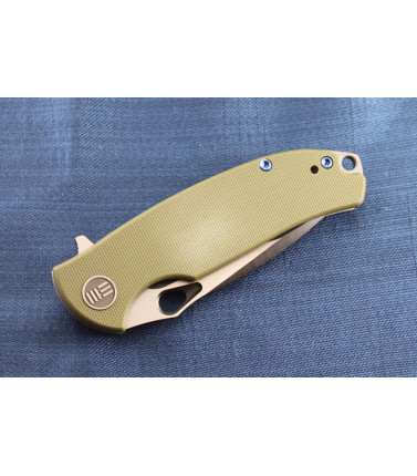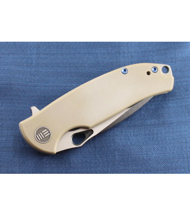 $99.99WE Knife 711D Blitz Flipper Linerlock. Features a 3.5" two-tone finished VG-10 stainless steel drop point blade. Textured Tan and Black G-10 handle scales. Dual nested steel liners. Pocket Clip oriented for right side tip-up carry. Includes polishing cloth and zippered pouch. FEATURES AND SPECIFICATIONS: --Blade Steel: VG-10 Stainless --Blade Style: Spear Point --Blade Grind: Hollow Grind --Blade Finiish: Two-tone Black with Satin Flats --Edge Type: Plain Edge --Handle Material: Textured Black and Tan G-10 --Lanyard Hole: No --Pocket Clip: Yes - Titanium - Tip up carry --Frame/Liner: Dual Nested Black Stainless Steel. --Action: Manual --Opener Flipper --Lock: Stainless Linerlock --Brand: WE Knife --Model Name: Blitz --Model Number: 711D --Use: everyday Carry (EDC) --Blade Thickness: 0.121" --Cutting Edge: 3 1/2" --Blade Length: 3 1/4" --Handle Length: 4 1/2" --Overall Length: 7 7/8" --Handle Thickness: 0.491" --Weight: 4 oz Country of Origin: PRC OTHER FEATURES: --Stainless Steel Screws and Pivot Cap --Ceramic Ball Bearing Washers --Titanium Backspacer -