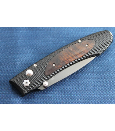 $750.00Limited Edtion of 100 pieces. The Lancet 'Island Wave' features a light and resilient frame in aerospace grade titanium, inlaid with black palm wood. The blade is 'Wave' damascus steel with a core in extra-strong ZDP-189 steel; the one-hand button lock and the thumb stud are set with spinel. Sleek, elegant, refined, and comfortable in the hand and to the eye, the Lancet defines the essential gentlemans folder in the modern world. The Island Wave features some of the exotic materials and hand-forged metals that are the hallmark of William Henry's collections; a distinctive personality statement to be worn and used for a lifetime. FEATURES and SPECS: One-hand button lock system Leather carrying case Shipped in an elegant wood presentation box Dimensions: Blade 2.75" (69.9mm) Handle 3.63" (92.2mm) Overall open 6.38" (162mm) USA -