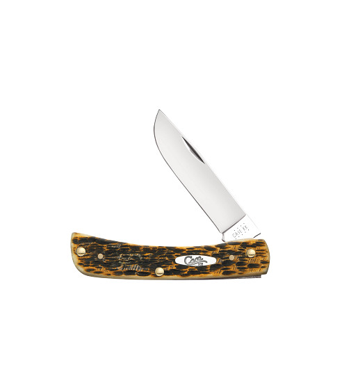 Case XX single blade Sodbuster Jr with bolsterless Amber Bone handles. Stainless Skinner blade.